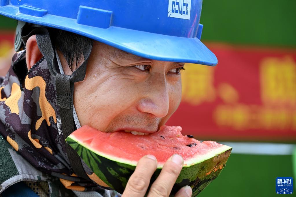 7月10日,中建二局青島濱海國際中心項目部的一名工人在休息站吃西瓜。