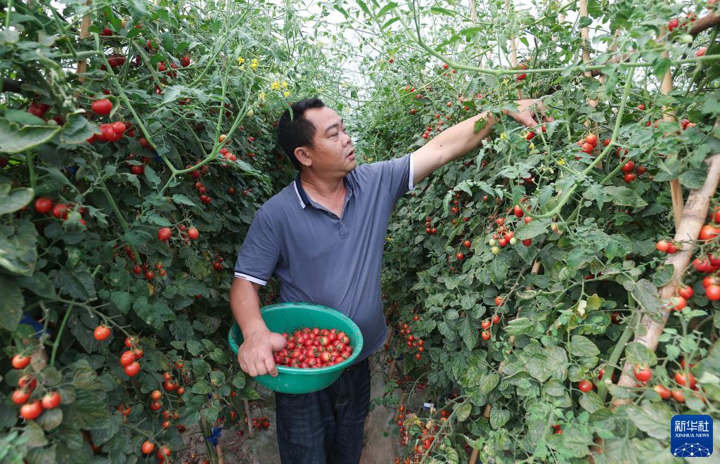 一位村民在四川省宜賓市南溪區長江村的“菜稻菜”蔬菜示范基地里采摘水果西紅柿(6月29日攝)。