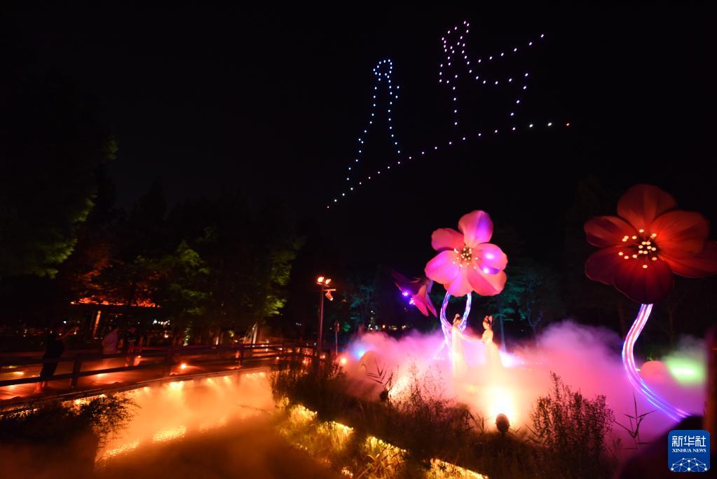 7月9日,在江蘇東臺西溪天仙緣景區,觀眾在觀看行進式夜間游園演出《尋仙緣》。