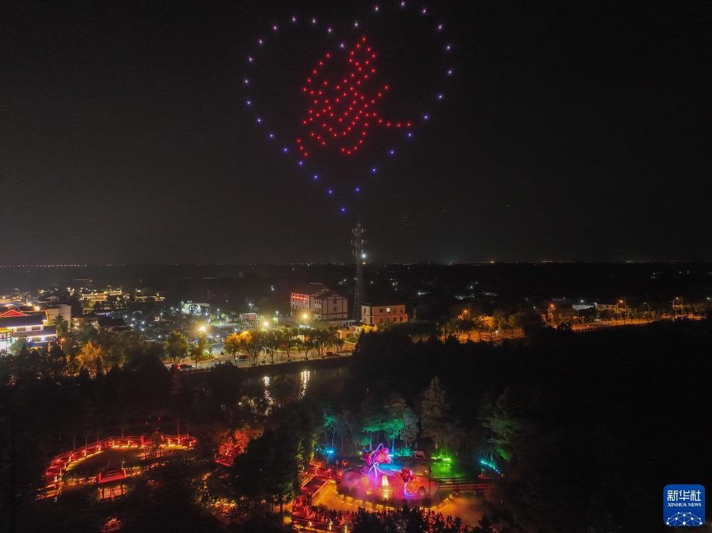 7月9日,在江蘇東臺西溪天仙緣景區,觀眾在觀看行進式夜間游園演出《尋仙緣》(無人機照片)。
