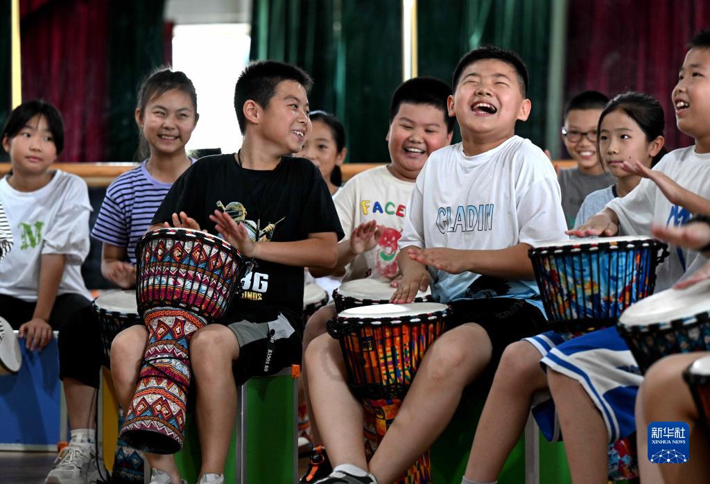 7月10日,學生在河北省石家莊市興華小學練習非洲鼓。