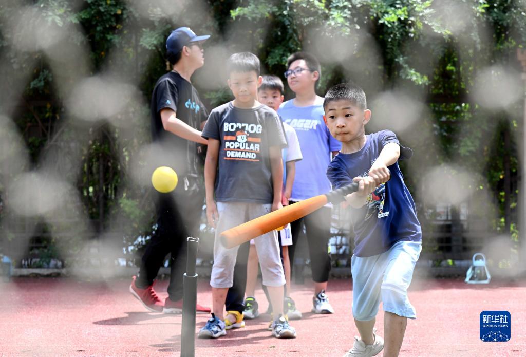 7月10日,學生在河北省石家莊市保利啟新小學暑期托管班練習軟式棒壘球。