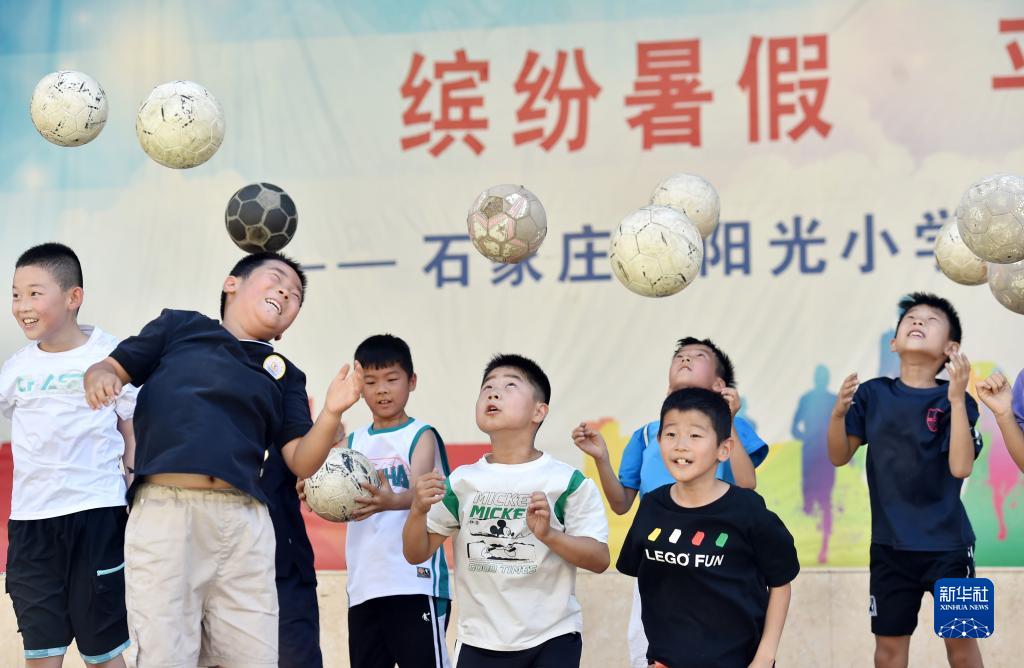 7月10日,在石家莊市陽光小學,學生進行足球訓練。