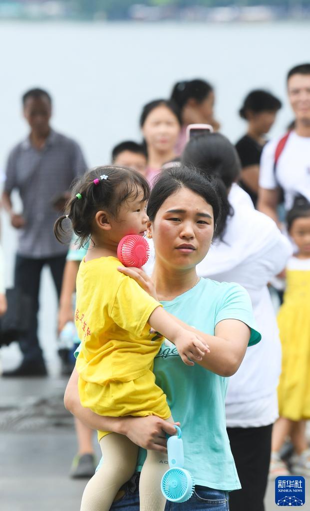7月10日,在杭州西湖景區,一位母親手持兩個風扇和女兒游玩。