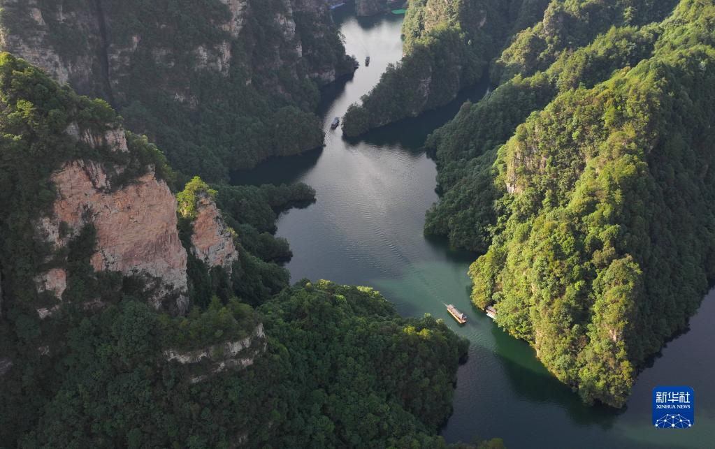 7月10日,游客乘船游覽張家界寶峰湖景區(無人機照片)。