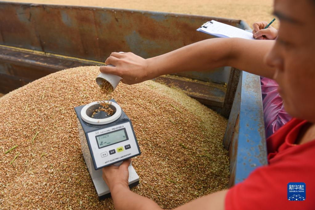 7月10日,在石嘴山市平羅縣姚伏鎮,農業工作者對小麥進行水分測量。