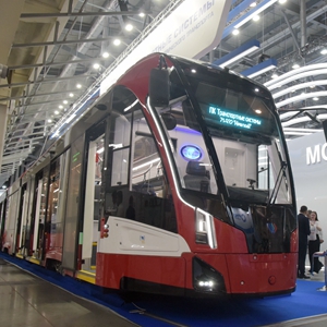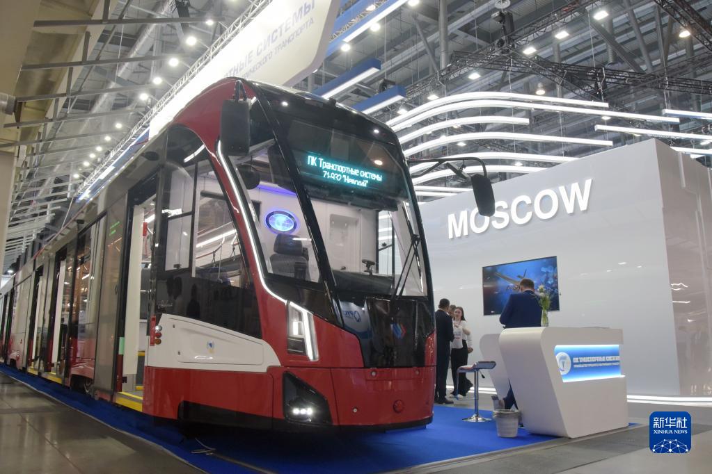 7月10日,一款配備自動駕駛系統的有軌電車在俄羅斯葉卡捷琳堡市舉行的國際創新工業展上展出。