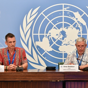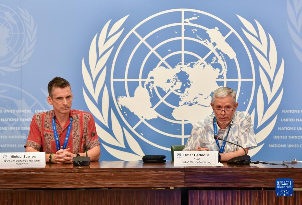 7月10日,在瑞士日內瓦,世界氣象組織官員奧馬爾·巴杜爾(右)在新聞發布會上就近期高溫天氣與厄爾尼諾現象進行說明。