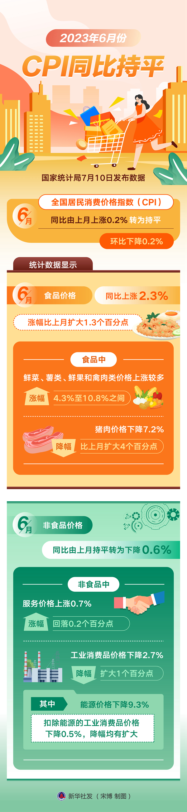 國家統計局7月10日發布數據,6月份,全國居民消費價格指數(CPI)同比由上月上漲0.2%轉為持平,環比下降0.2%。上半年,CPI平均比上年同期上漲0.7%。