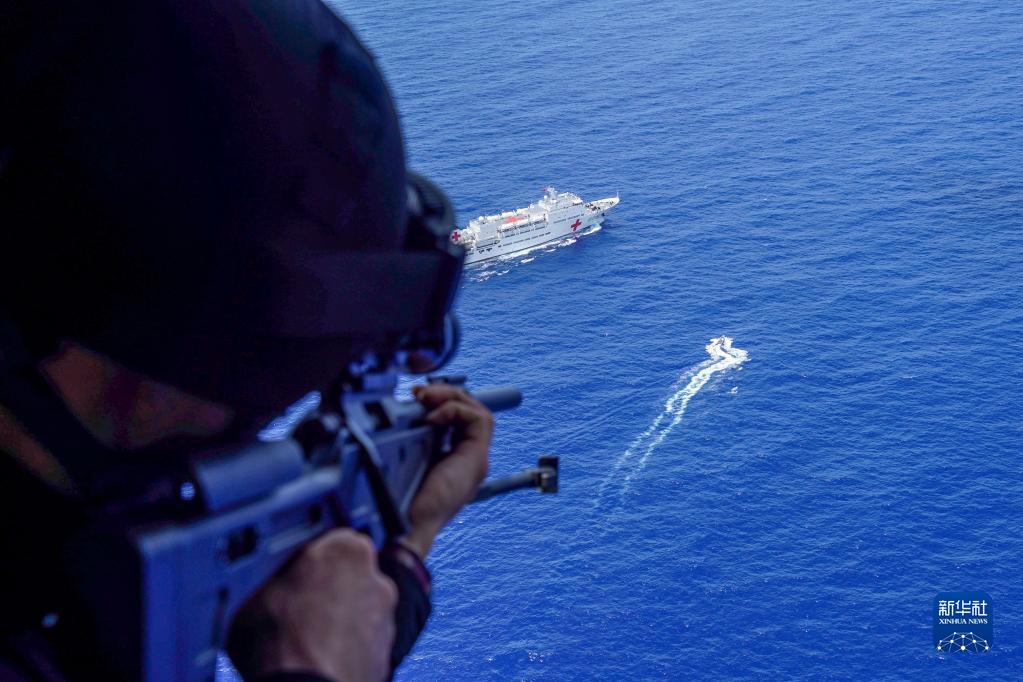 7月10日,中國海軍“和平方舟”號醫院船在太平洋上組織反恐反海盜演練。這是空中打擊組進行火力支援。