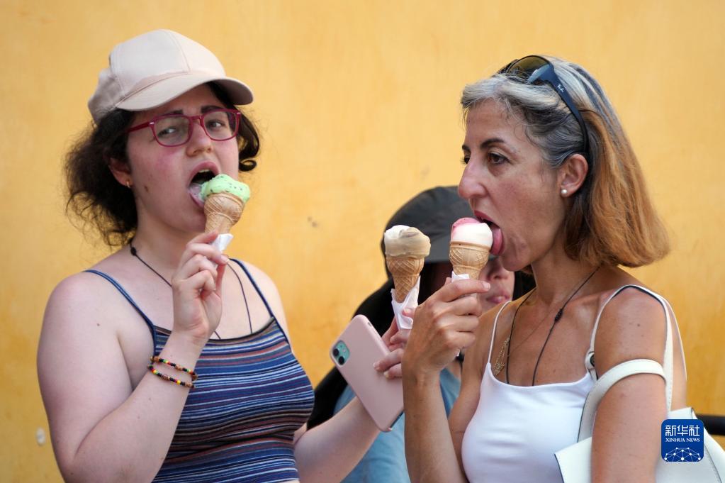 7月10日,人們在意大利羅馬吃冰淇淋解暑。