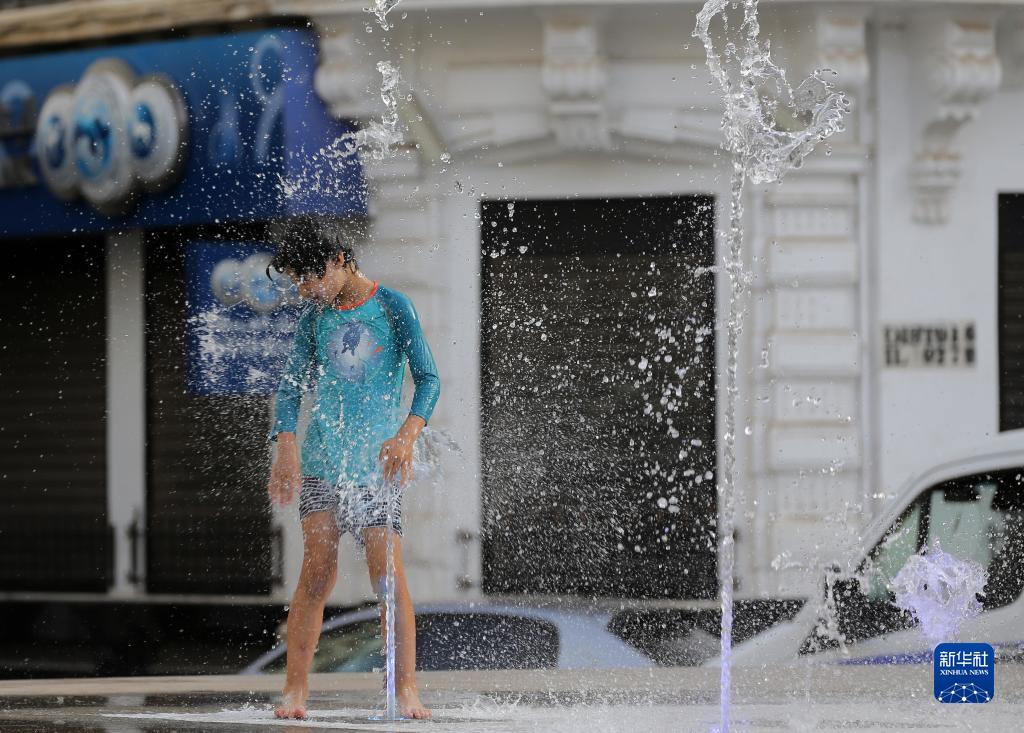 7月10日,一名兒童在阿爾及利亞首都阿爾及爾一處噴泉戲水消暑。