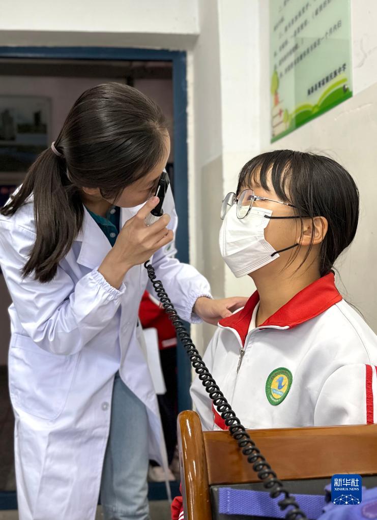 7月7日,北京協和醫院醫生在青海省海北藏族自治州海晏縣寄宿制民族中學為學生做視力檢查。