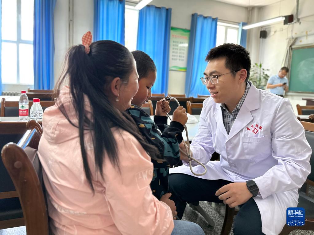 7月7日,北京協和醫院醫生在青海省海北藏族自治州海晏縣寄宿制民族中學與孩子和家長交流,了解病情。