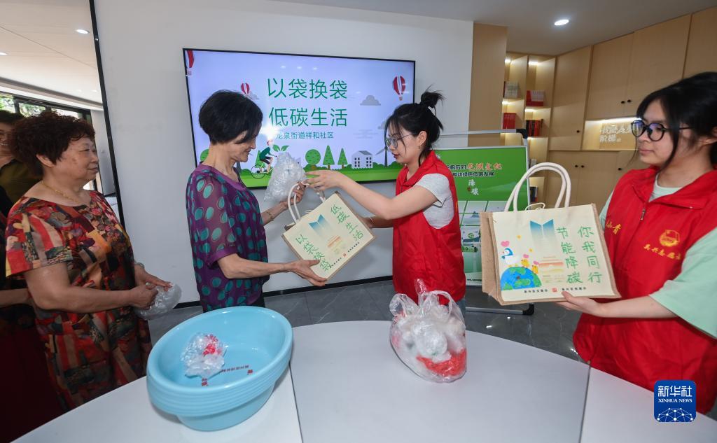 7月11日,浙江省湖州市吳興區龍泉街道祥和社區開展“以袋換袋”低碳主題活動,鼓勵居民把家中的一次性塑料袋換取可以重復使用的環保袋。