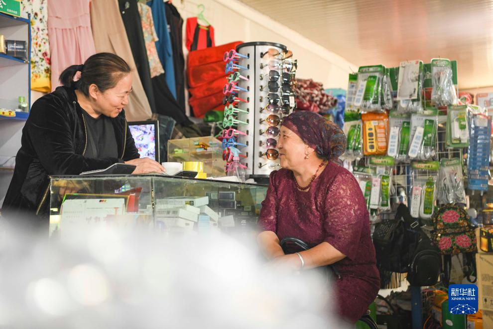 巴哈提(右)在采購物資時和商店老板湯新英聊起最近要轉場的事情(7月2日攝)。巴哈提說,自己和湯老板有幾十年的交情,彼此非常熟悉。