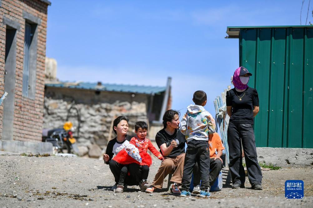 哈布得拉什么趕著羊群離家后,他的大女兒加孜拉(右一)、小女兒昆樹阿克(左三)和侄女(左一)、孫輩們齊齊望著轉場人群遠去的方向(7月3日攝)。