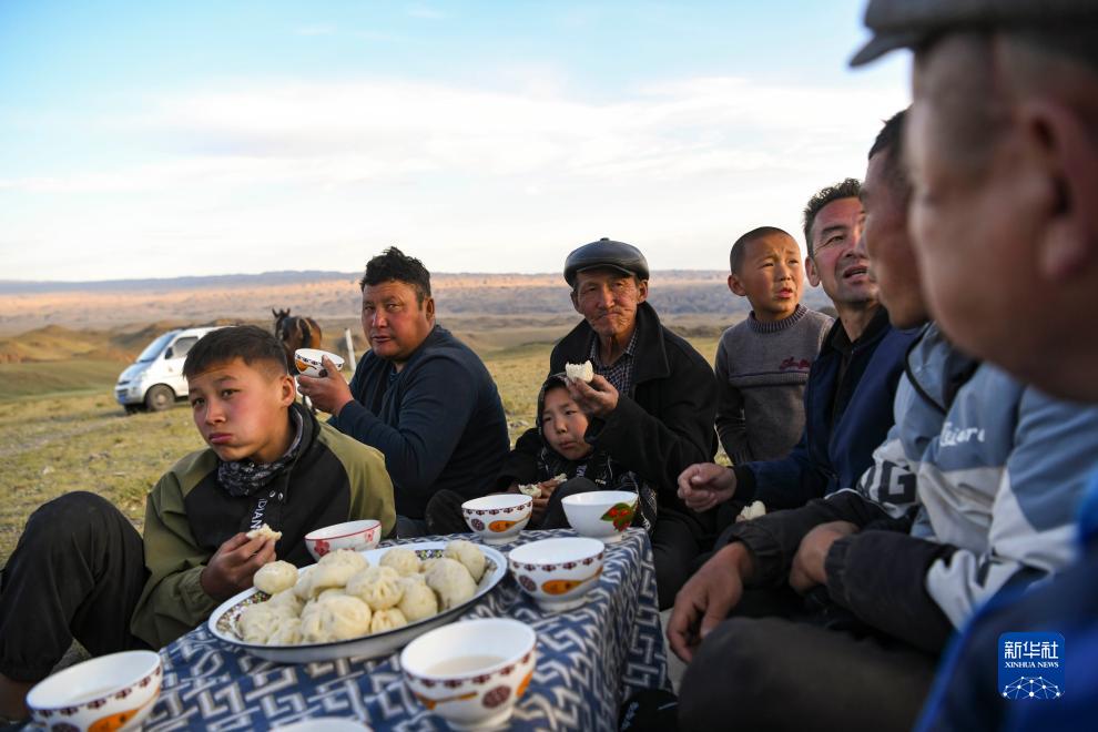 轉場隊伍抵達第一天的露宿營地后,哈布得拉什么(左三)和親人們一起席地而坐吃晚飯(7月3日攝)。