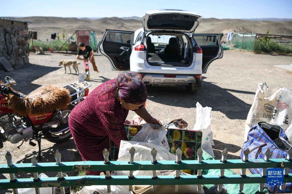 巴哈提和小女兒昆樹阿克整理家中轉場所需的物品,并準備打包裝車(7月3日攝)。第一天的路相對平坦,汽車可以把物資運到山腳。