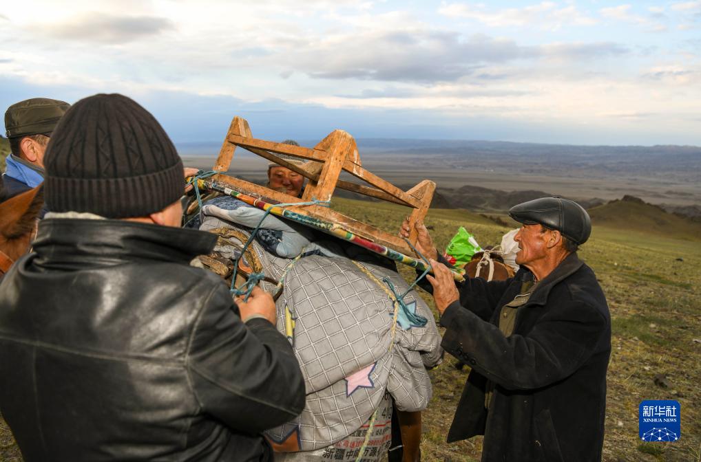 轉場第二天清晨,哈布得拉什么(右)和家人把轉場物品綁到馬背上,向夏牧場繼續前進(7月4日攝)。