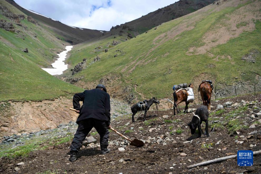 到達夏牧場后,哈布得拉什么在清理羊圈(7月3日攝)。
