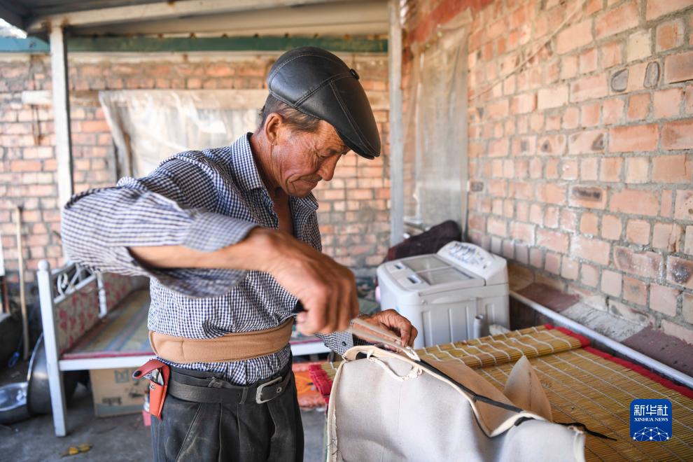 哈布得拉什么在家中整理用于轉場時裝貨的布袋(7月2日攝)。