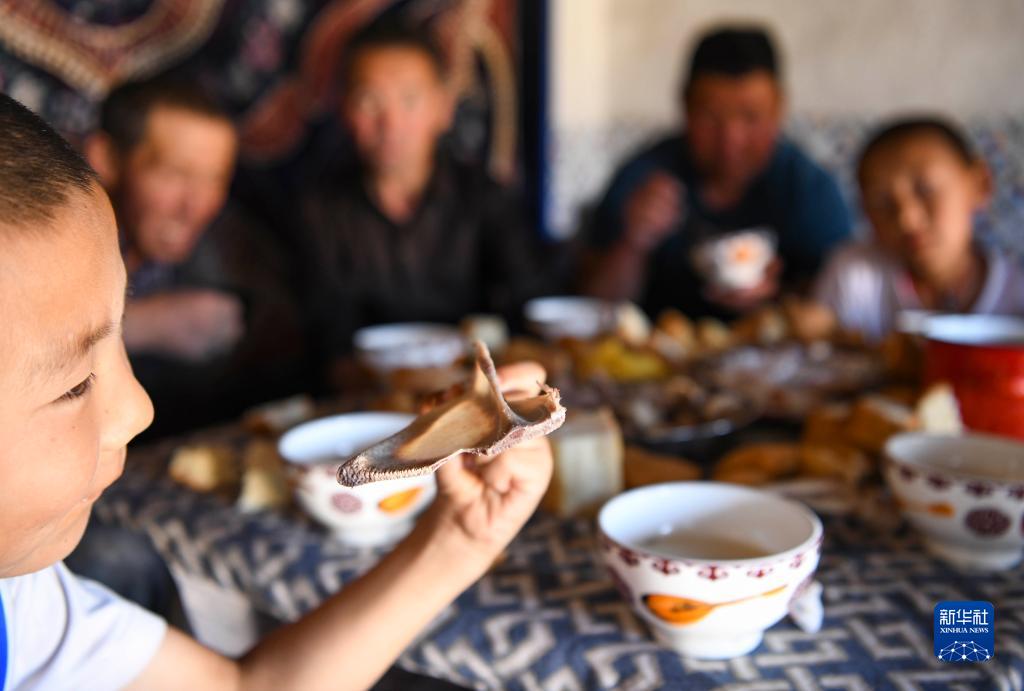 轉場出發前的聚餐上,一名小朋友拿起一塊羊的肩胛骨玩耍。按習俗,負責削肉的親人會在骨頭上切開三角豁口,寓意“前路平坦,此行平安”(7月3日攝)。