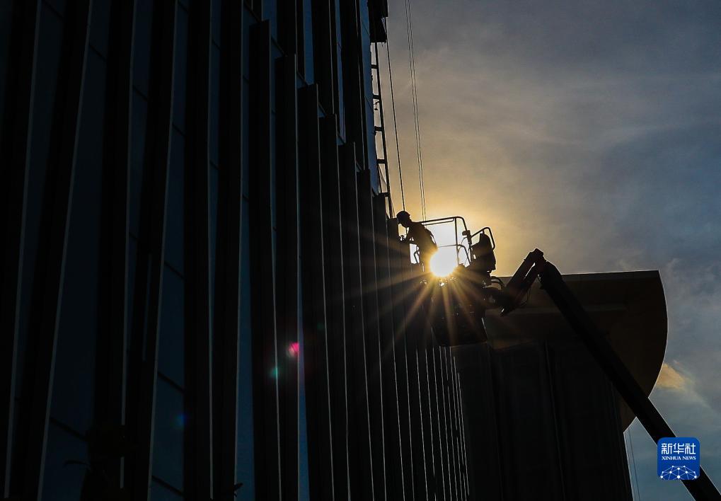 建設者在國際金融論壇(IFF)永久會址進行幕墻施工(7月10日攝)。