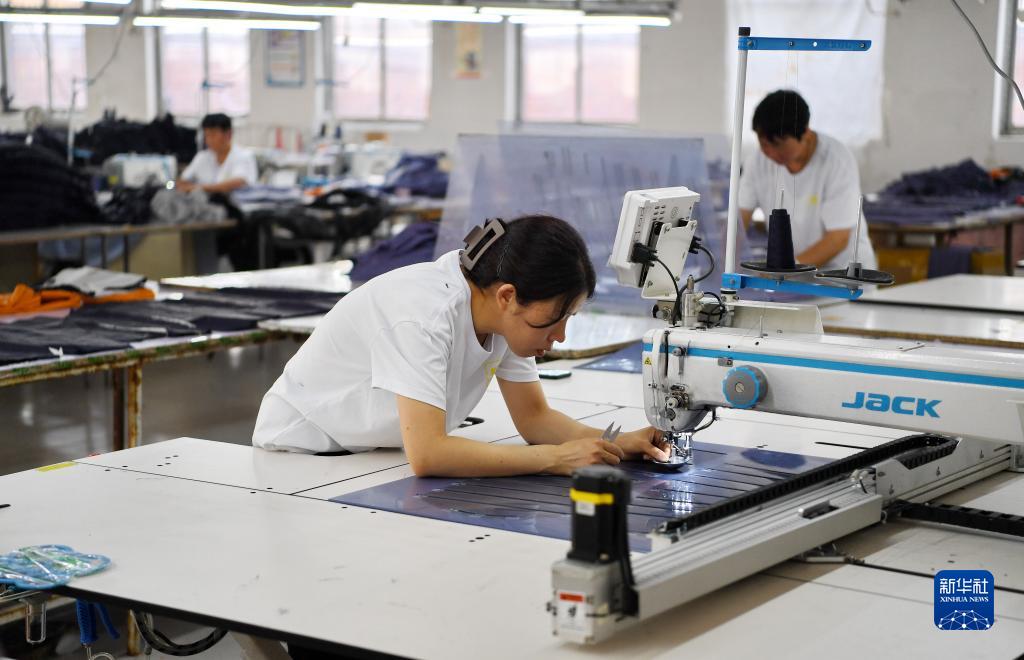 7月11日,河北省遷安市上射雁莊鎮七里坎村一家服裝加工企業的工人在車間內工作。