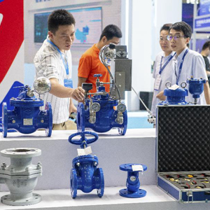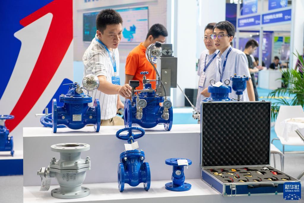 7月11日,參觀者在2023深圳國際水務科技博覽會了解閥門產品。