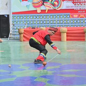 7月11日,在大化瑤族自治縣仁良村,村民在陀螺文化展演活動中跳陀螺舞。