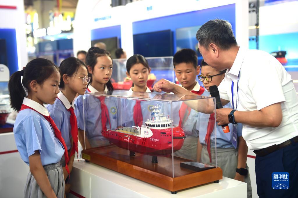 7月11日,滄州市實驗小學學生在2023年航??萍疾┯[會上了解中海油田服務股份有限公司的新型船舶。