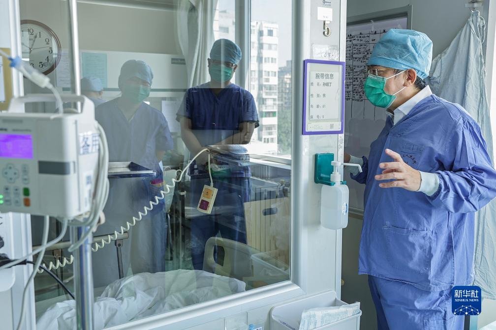 6月30日,黃曉軍在北京大學人民醫院血液科骨髓移植倉里查房。