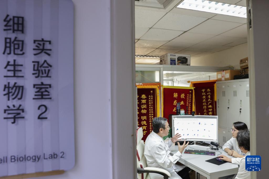 6月30日,黃曉軍(左)和青年骨干在北京大學血液病研究所討論工作。