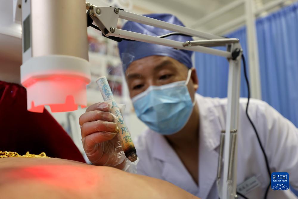 7月11日,山東省棗莊市文化西路一家中醫門診的醫生在為市民進行“懸灸”和“罐灸”治療。