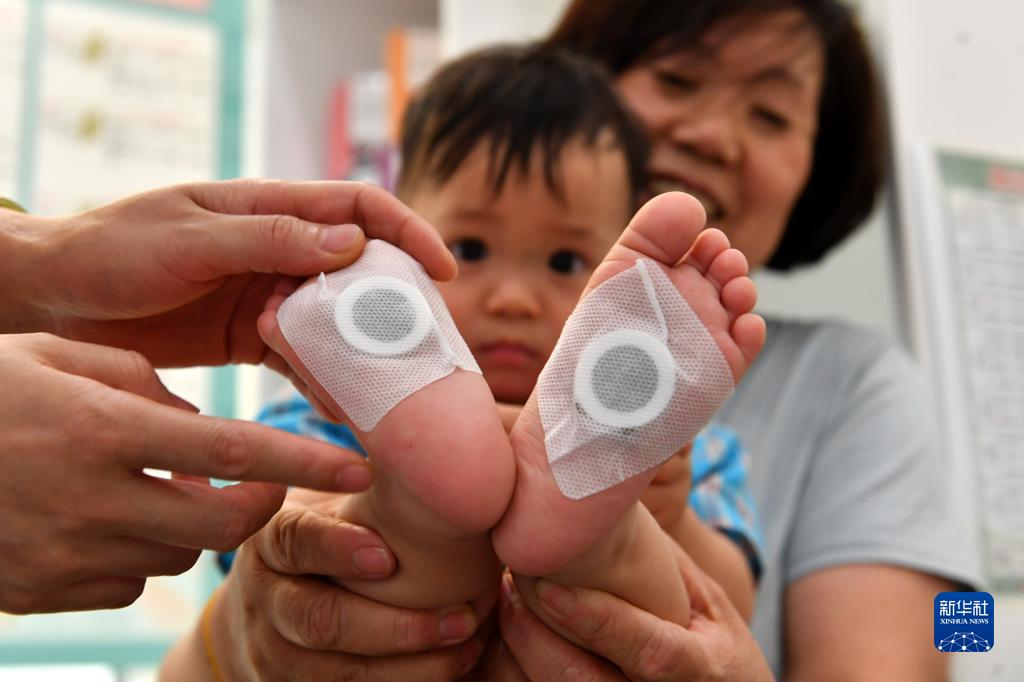 7月11日,在河南省夏邑縣一家母嬰亞健康調理中心,工作人員為小朋友貼“三伏貼”。