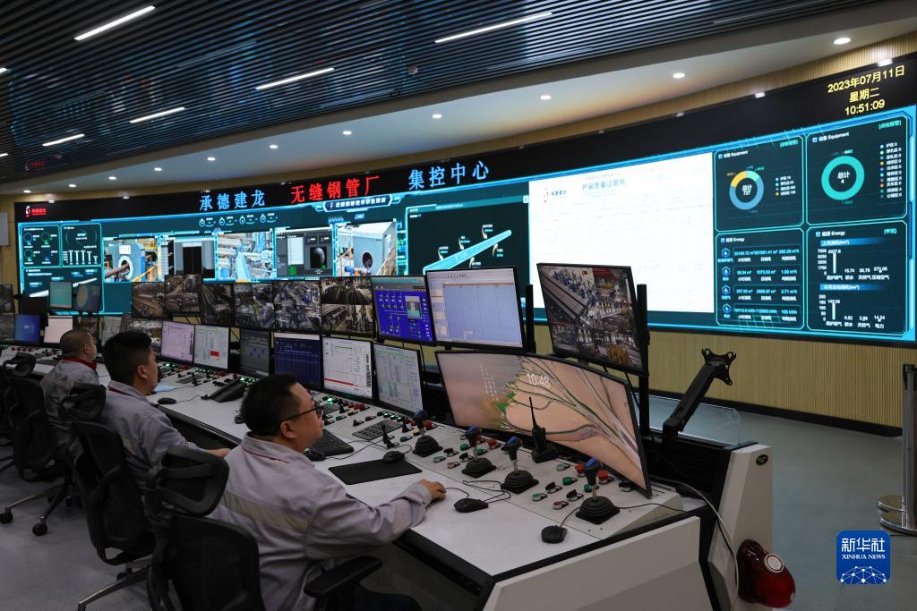 7月11日,在承德市鷹手營子礦區一家無縫鋼管生產企業,工作人員在集控中心工作。