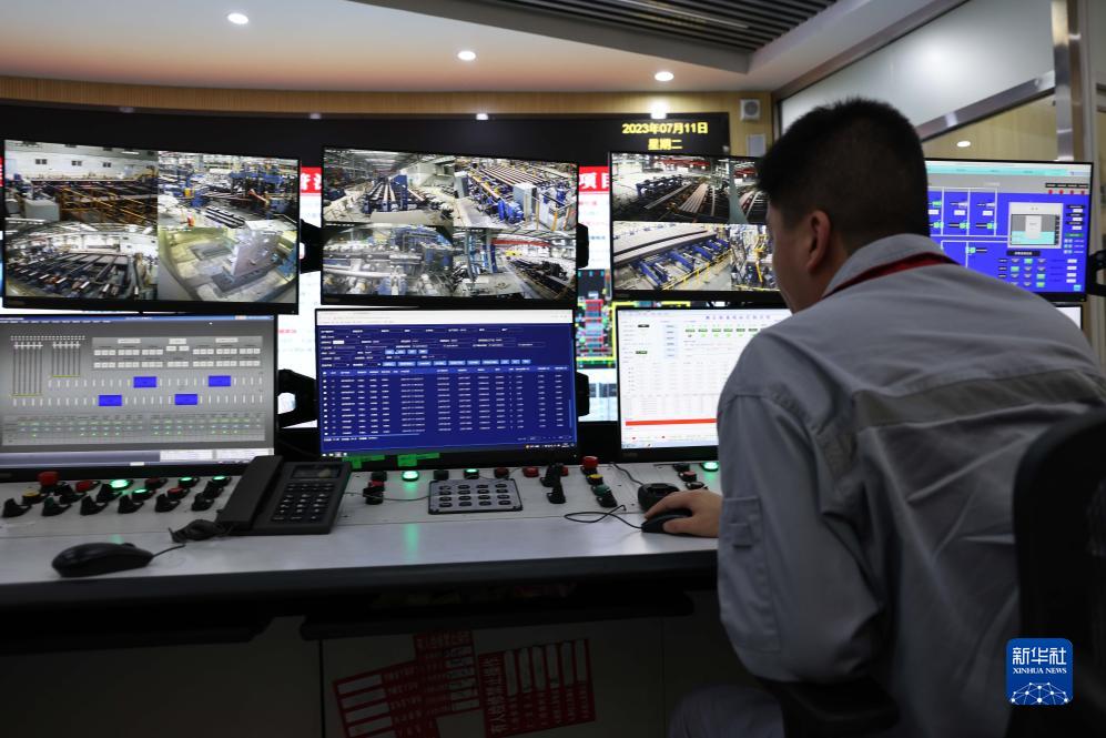 7月11日,在承德市鷹手營子礦區一家無縫鋼管生產企業,工作人員在集控中心工作。