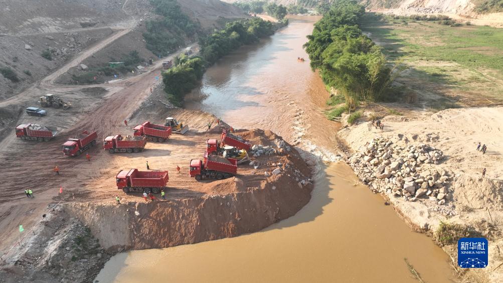 這是7月10日在盧旺達北方省加肯凱市拍攝的中企承建盧旺達那巴龍格河二號水電站項目截流現場(無人機照片)。