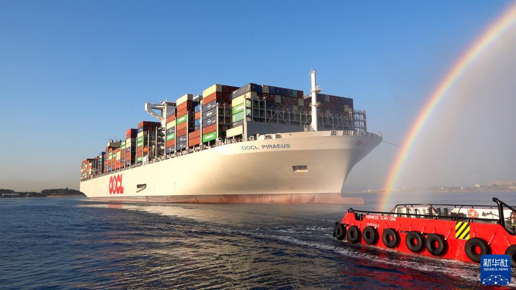 “東方比雷埃夫斯”號大型集裝箱船10日抵達希臘最大港口比雷埃夫斯。港方以“水門禮”歡迎這艘近400米長的集裝箱船首航掛靠比港?!皷|方比雷埃夫斯”號長399.9米,寬61.3米,可裝載24188個標準集裝箱,是世界上最大的集裝箱船之一。