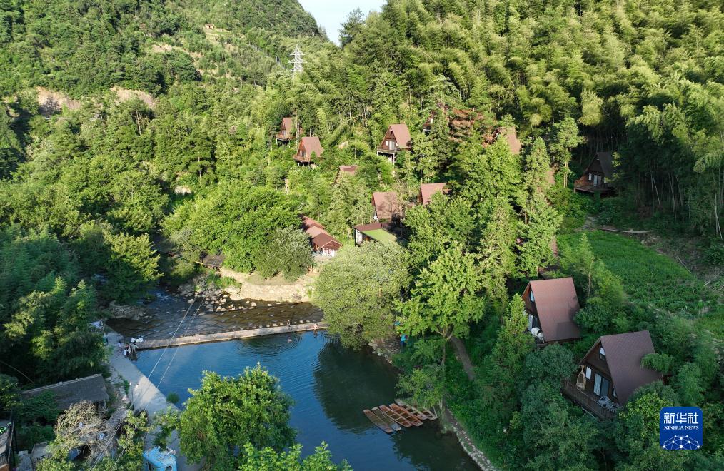 7月11日,人們在杭州臨安高虹鎮江南秘境游玩(無人機照片)。