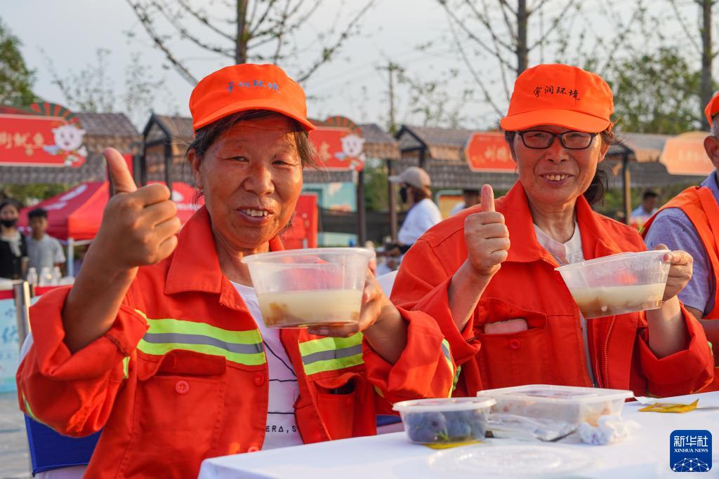 7月11日,在安徽省宿州市蕭縣水墨圣泉古鎮廣場,環衛工人品嘗羊湯。