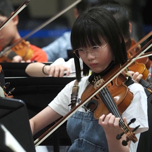 7月11日,“MISA學生節日樂團”弦樂聲部的學生在進行首次聯排。