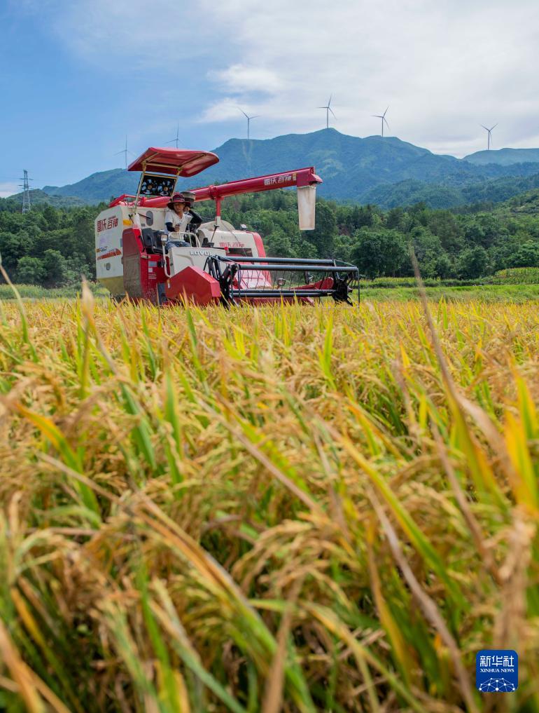 7月10日,在湖南省永州市道縣四馬橋鎮金獅庵村,農民駕駛農機在田間收割早稻。