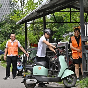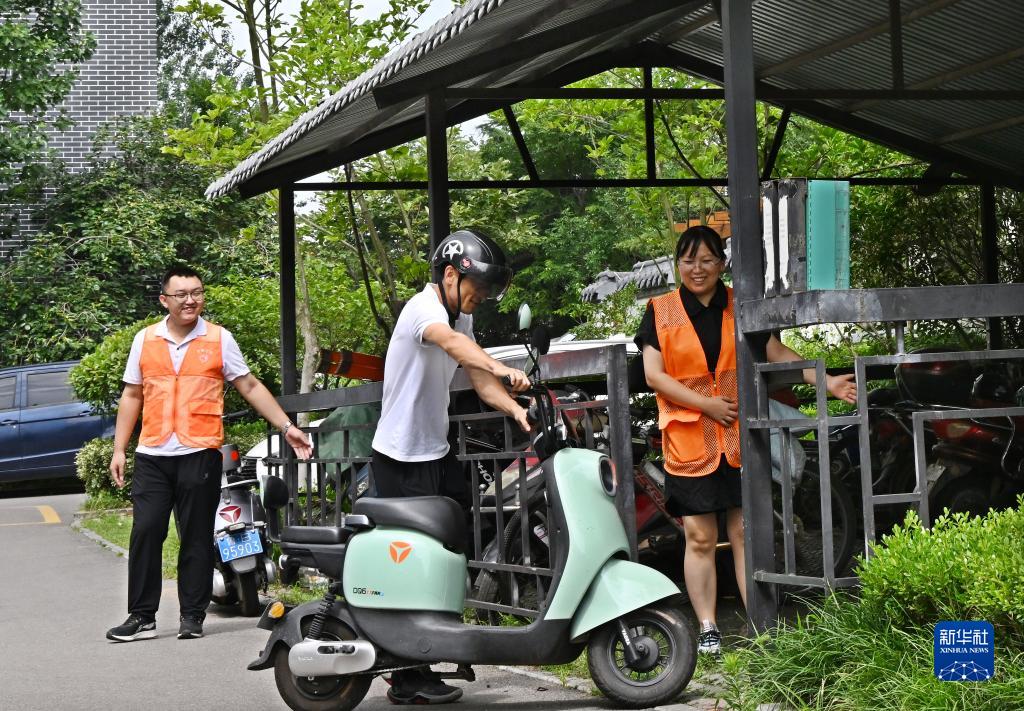 7月11日,青島膠州市少海瀾山小區工作人員引導居民將電動自行車停進集中充電點。