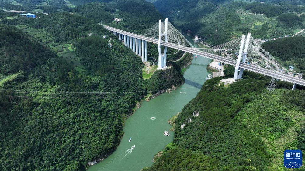 7月11日,游客在貴州省遵義市播州區楠木渡景區乘快艇游覽(無人機照片)。
