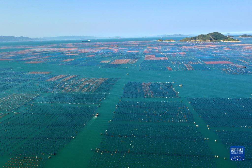 7月11日,在連江縣下宮鎮松蘆灣海域,漁民駕駛漁船穿梭在海上牧場(無人機照片)。