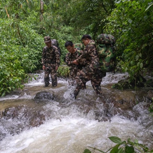 7月8日,在高黎貢山國家級自然保護區,巡護隊員互相幫助蹚過湍急的溪流。