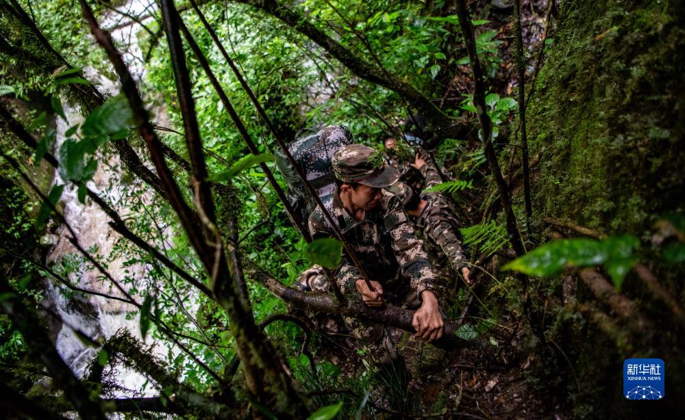 7月8日,在高黎貢山國家自然保護區,巡護隊員抓著樹根順著接近90度的懸崖慢慢滑下。新華社記者 江文耀 攝