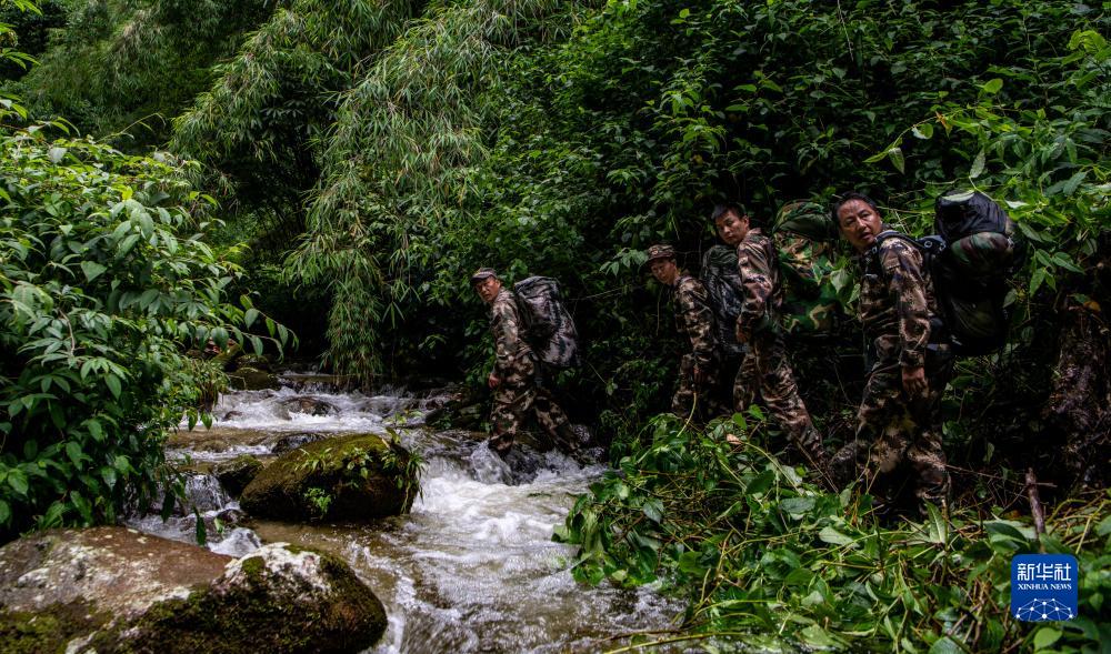 7月8日,何貴品(右一)與巡護隊員在高黎貢山國家級自然保護區巡護中。新華社記者 江文耀 攝